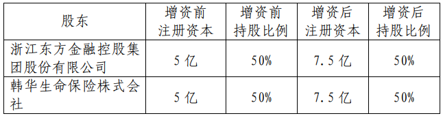 2017年8月,浙江东方与韩华生命对中韩人寿进行等比例增资方案获批。增资后,中韩人寿注册资本由初始资本5亿元增至10亿元。