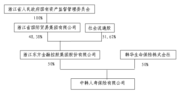 2017年4月,原保监会批准浙江国贸将其持有的中韩人寿50%的股份转让给上市公司浙江东方,浙江国贸退出中韩人寿。而原股东浙江国贸为新股东浙江东方的控股股东,持股比例48.38%,浙江省国资委100%控股浙江国贸。